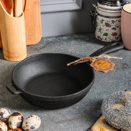 De serveerpan is gemaakt van hoogwaardig gietijzer, wat betekent dat het bestand is tegen hoge temperaturen en gelijkmatig warmte verdeelt. Dit maakt het ideaal voor het bereiden van voedsel zoals vlees, vis en groenten. Bovendien kan de pan worden gebruikt op alle soorten kookplaten, inclusief inductie.