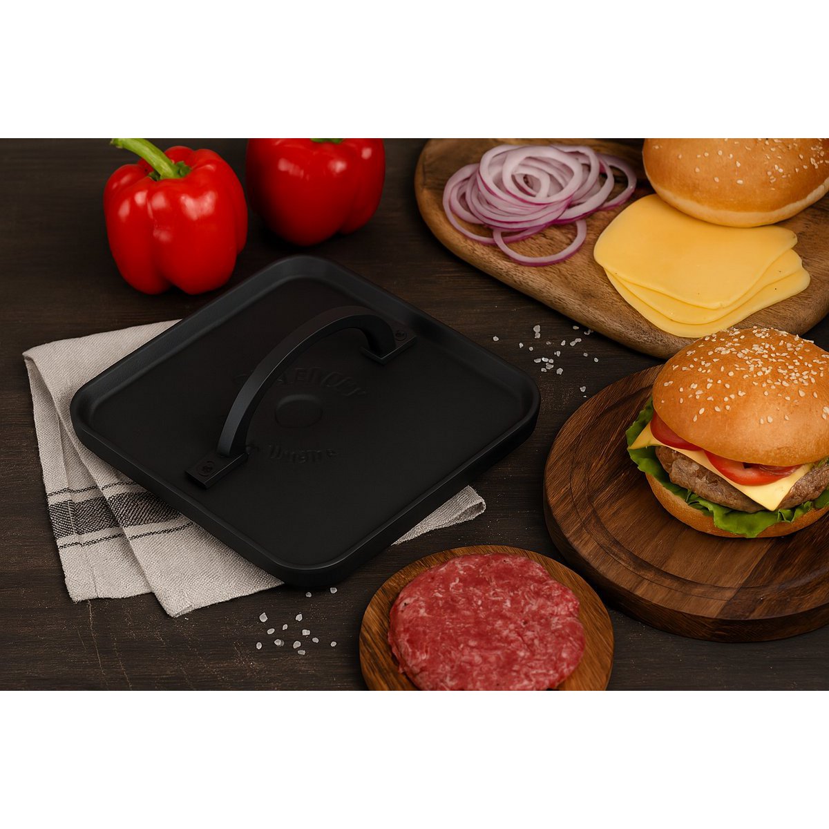 Deze stevige, handgemaakte pers is volledig vervaardigd uit massief gietijzer, waardoor hij het vlees gelijkmatig platdrukt voor maximale karamellisatie en smaak.