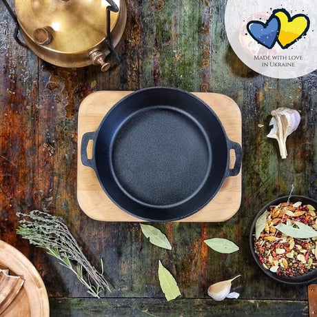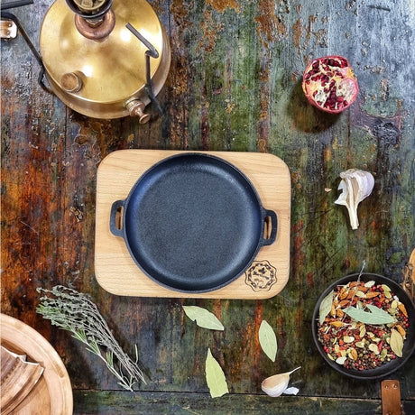Maysternya Gietijzeren Serveerpan op houten plank - Ø 18 x 2.5 cm