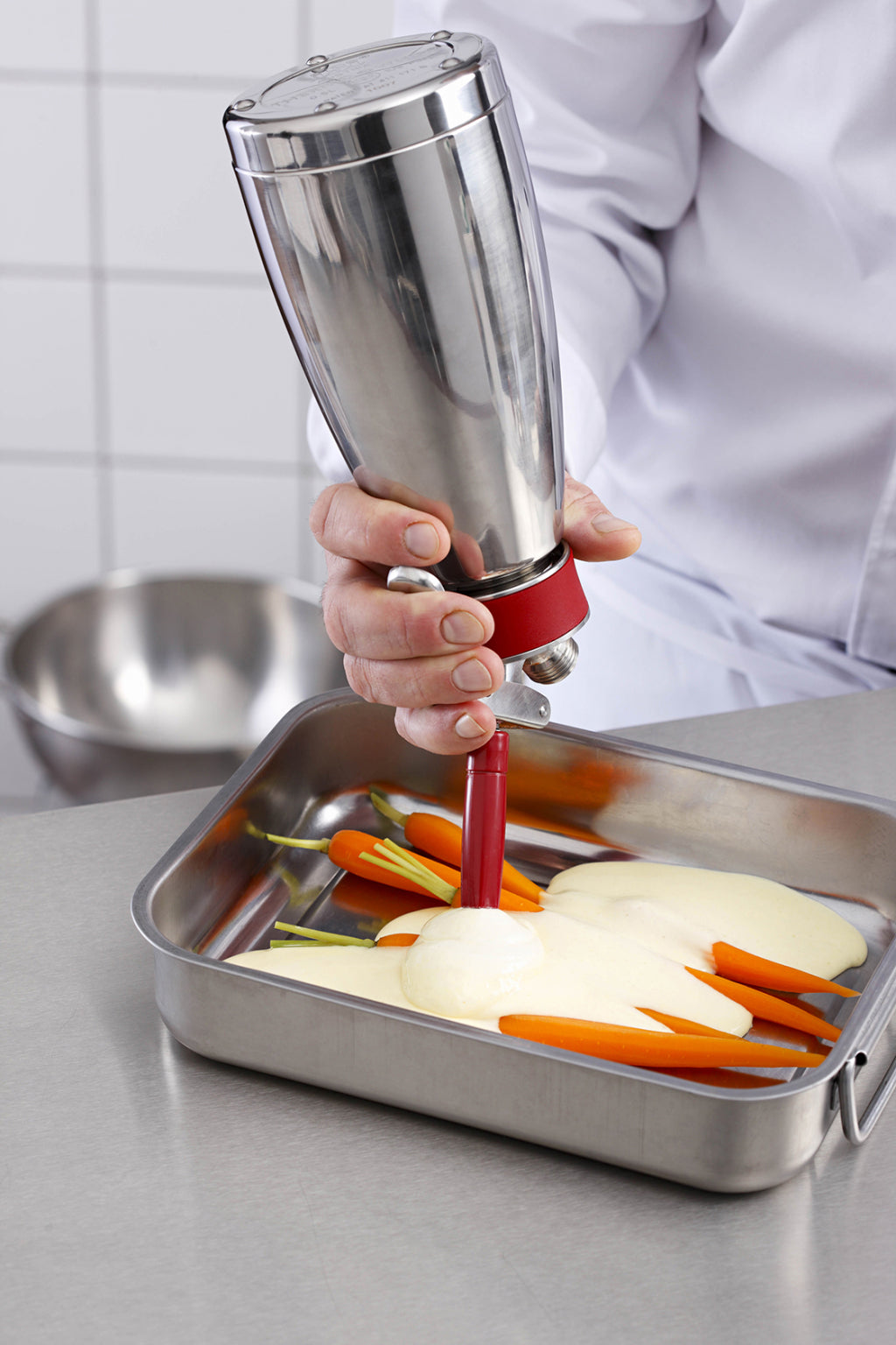 Thermisch geïsoleerde iSi Thermo Whip, for Professionals, met een maximaal vulvolume van 0,5 L. Voor zowel warme en als koude bereidingen. Houdt uw creaties urenlang koud of warm. Het veelzijdige gereedschap voor kook- en cateringgemak. Voor het bereiden van zowel lichte en luchtige schuimen, hapjes, warme en koude sauzen, soepen, slagroom en desserts. Roestvrijstalen fles en kopstuk ontworpen voor professioneel gebruik. De kop heeft een beschermende siliconen greep en een vaste roestvrijstalen klep voor eenvoudig gebruik, zelfs bij warme bereidingen. De hittebestendige siliconen pakking met verwijderingslipje zorgt voor een snelle en hygiënische reiniging.
